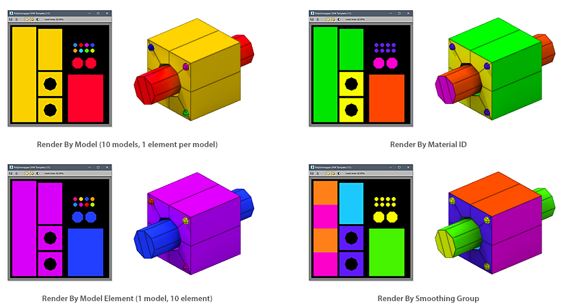Bounding Rect.: Render the Shell's Bounging Rectangles only using one color per rectangle.Note: The palette used to render the Models and Materials IDs is defined by an image "id_palette.png" found in "PolyUnwrapper/ui" folder. The default palette image has 256 colors.
